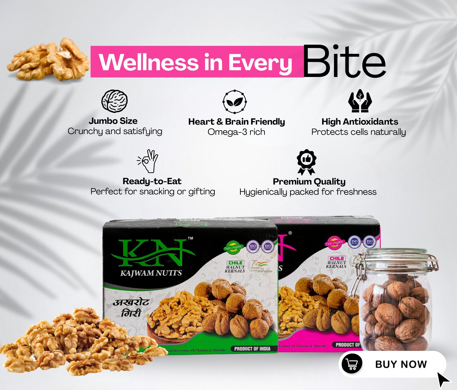 Akhrot (Walnuts): High in omega-3 fatty acids, our walnuts are a great addition to your daily routine for improved brain health and overall wellness.